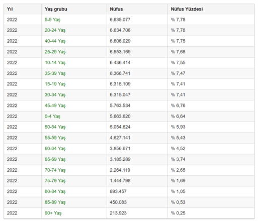2022 yılına göre Türkiye nüfusunun yaş gruplarına göre nüfus dağılımı ve nüfus yüzdesi de şöyle: