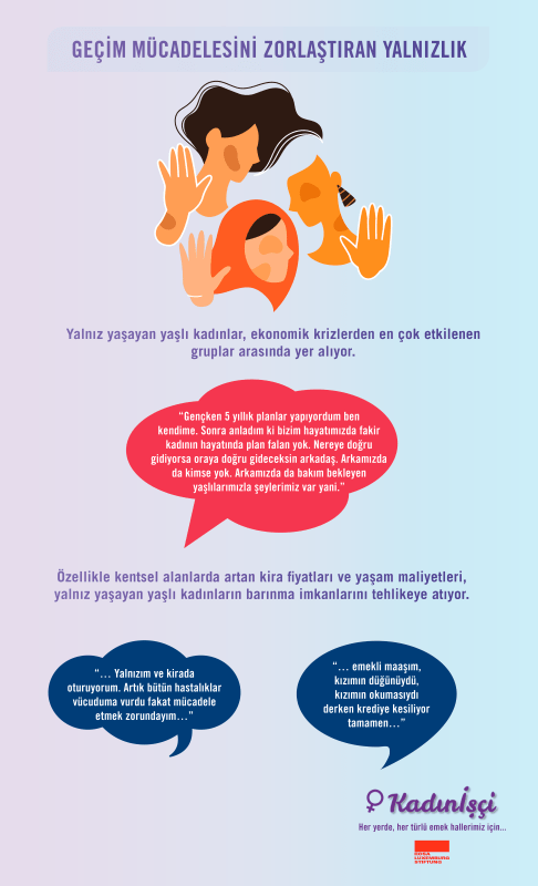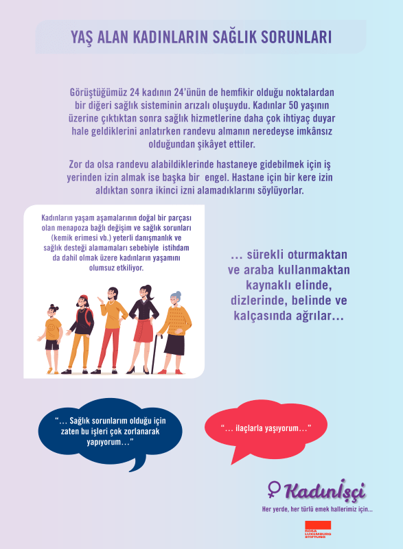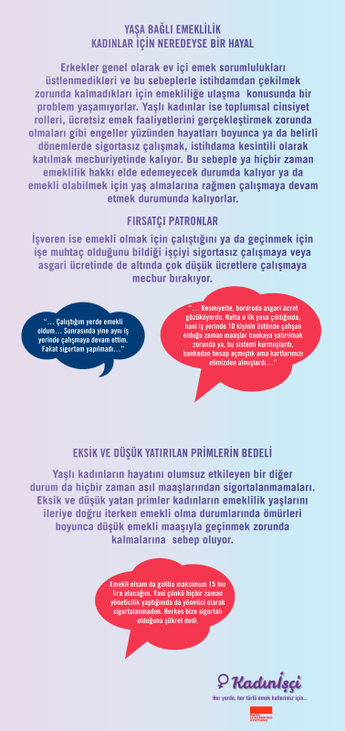 Görüşme yapılan 24 kadından ancak 13’ü emekli olabilmiş, 11’i henüz emekli olamamış, 11 kadından 6’sı ise yaş almalarına rağmen, sürekli güvencesiz işlerde çalıştıkları için hiçbir zaman emekli olamayacaklar. Sadece bu sayılar bile yaş alan kadınların ne tür bir yoksullukla karşı karşıya olduklarını bize gösteriyor.