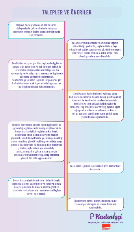 50 yaş üstü kadınların, çalıştıkları süre içinde işyerinde karşılaştıkları yaş almayla iyice artan cinsiyet temelli güvencesiz çalışma, düşük ücret, mobbing ve şiddetin, yetersiz emeklilik aylıklarıyla mahkûm edildikleri yoksulluğun tüm boyutlarıyla açığa çıkarıldığı ve bu alanda bir ilk olan araştırmada, sorunların giderilmesi için politika oluşturmak gibi dertleri ve hedefleri olan kesimlere yönelik politika önerileri de sıralanıyordu.